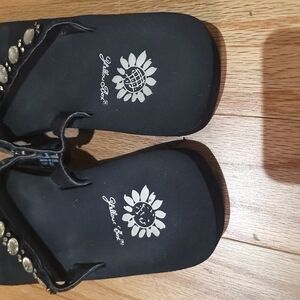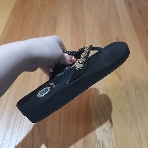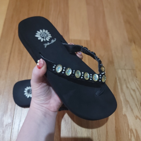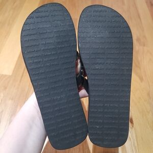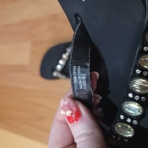 Elegant black sandals with sparkling gold embellishments. Ideal for casual outings. No missing stones, very cushioned & comfy flip flops. Light wear on insude of straps.