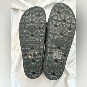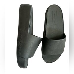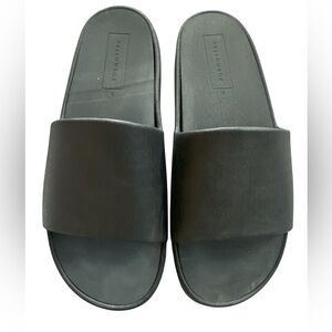 Sleek black slide sandals. Comfortable and stylish. Perfect for casual wear.