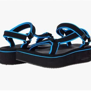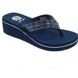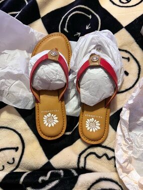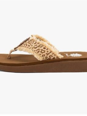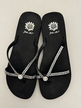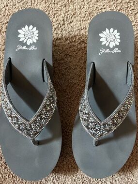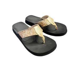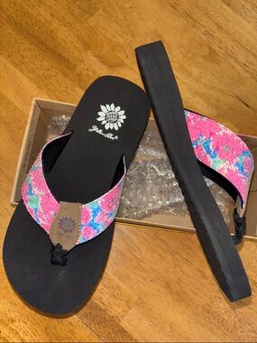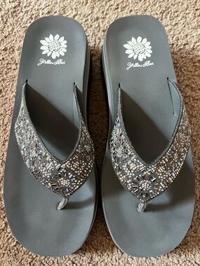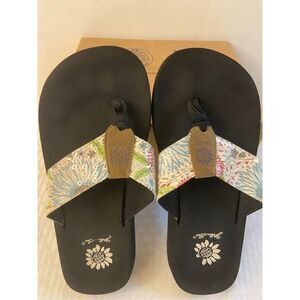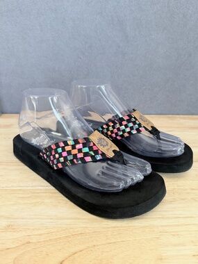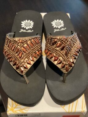 Yellow Box platform flip flops with black footbeds. Brown croc-texture thong straps. Branded sunflower logo on footbed and strap. Casual elevated summer sandal.