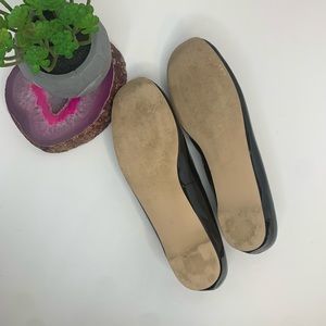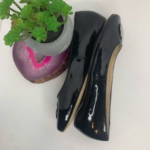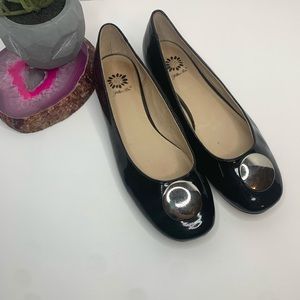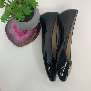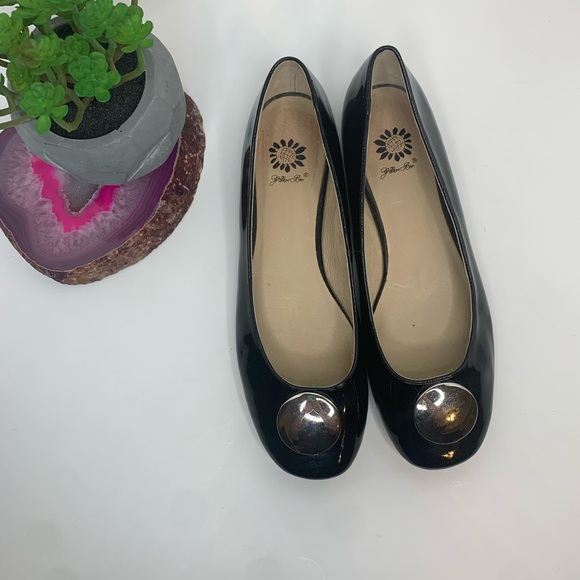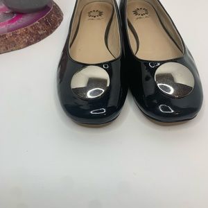 Black patent leather flats with silver emblem.