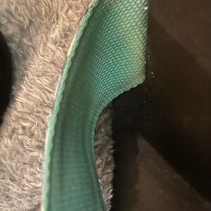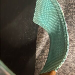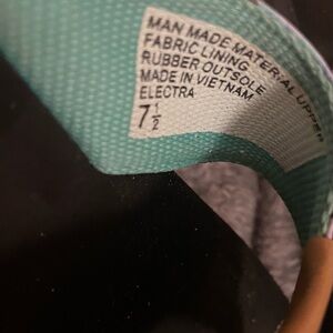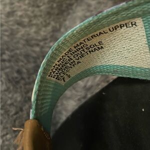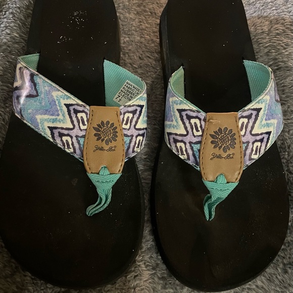 Yellow Box sandals with a colorful pattern. Features a mix of teal, purple, and tan colors. Size 7.5 US