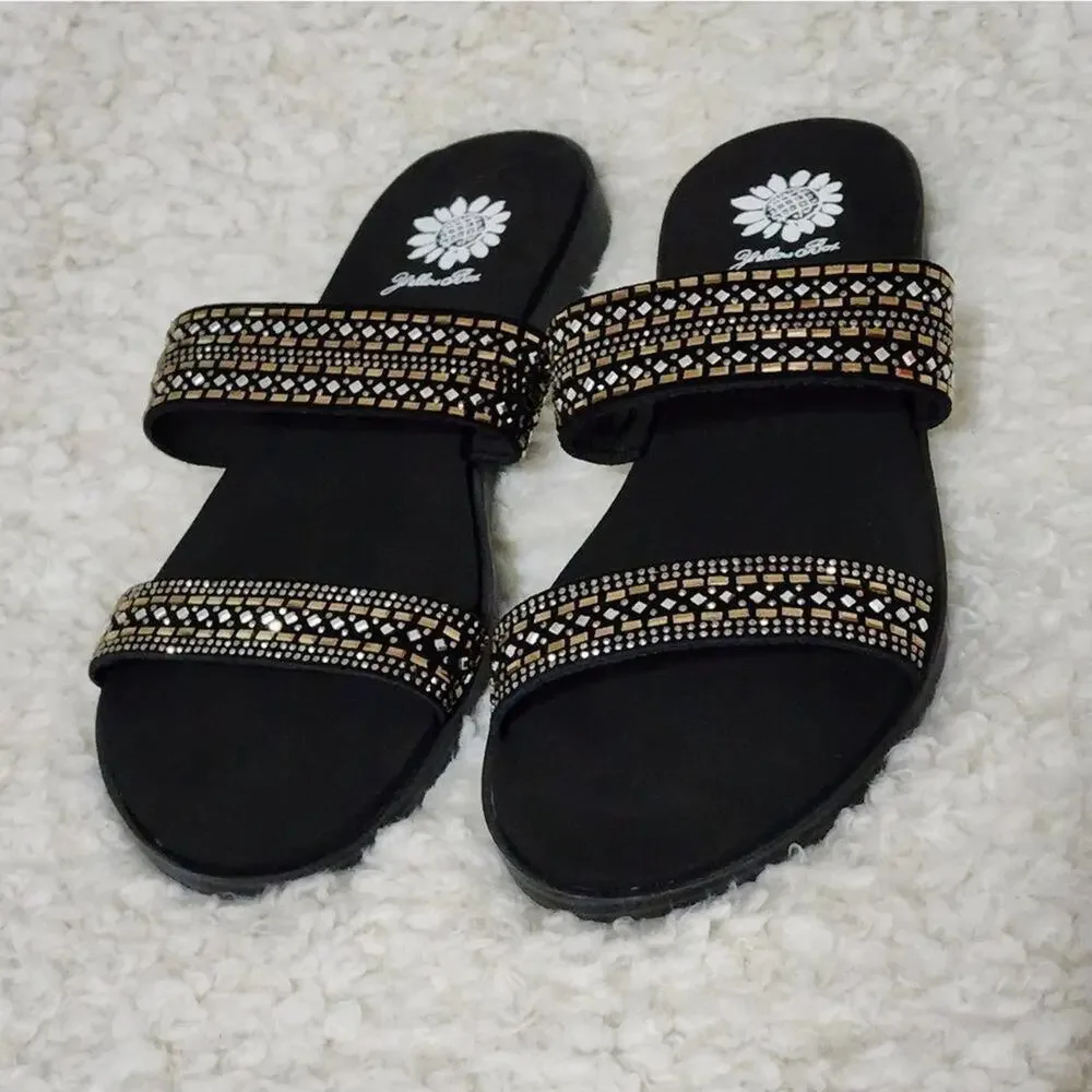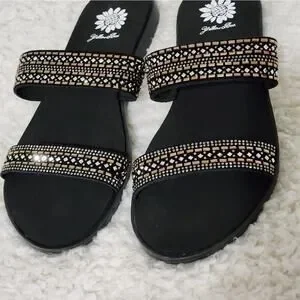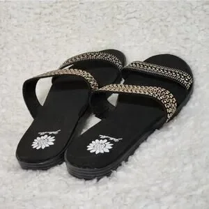 Shimmer as you step with the Delfie slip-on sandals. These easy slide sandals have a comfortable padded footbed, and are adorned with geo-shaped rhinestones for eye-catching style. These double-banded sandals look great paired with dresses, shorts, or jeans!