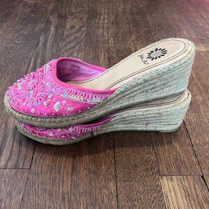 Fuchsia espadrilles with detailed beadwork. Easy slip-on style. Ideal for casual wear.