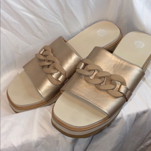 Chic metallic gold sandals with chain detail. Comfortable slide design. Ideal for casual outings.