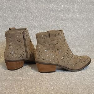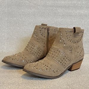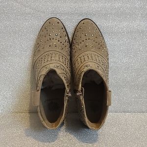Covered in gun metal gray studs. Taupe color. Almond toe. NWOT. Please see last picture for slight flaws or imperfections.