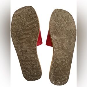 Chic red slides with textured strap. Ideal for casual wear. Comfortable and stylish.