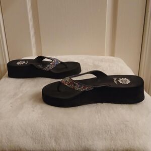 Yellow Box Scalia Y2K-inspired black platform flip flop sandals with multi-colored rhinestone straps and wedge heel in size 7.