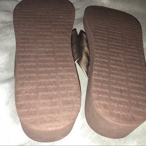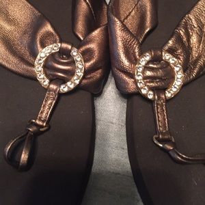 Yellow Box wedge heel sandals with rhinestones on the bronze straps. There are 2 small indentions in the rubber where your toes would be but won't be seen when worn. Make an offer!