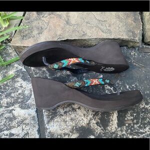 Yellow Box Tribe Turquoise Brown Orange Beaded 2” Wedge Sandal’s Size 7 Women’s