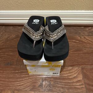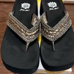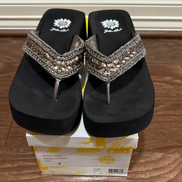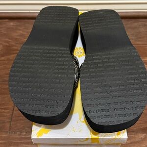 Elegant Yellow Box sandals with black base silver and gold accents. Perfect for stylish outings or casual wear.