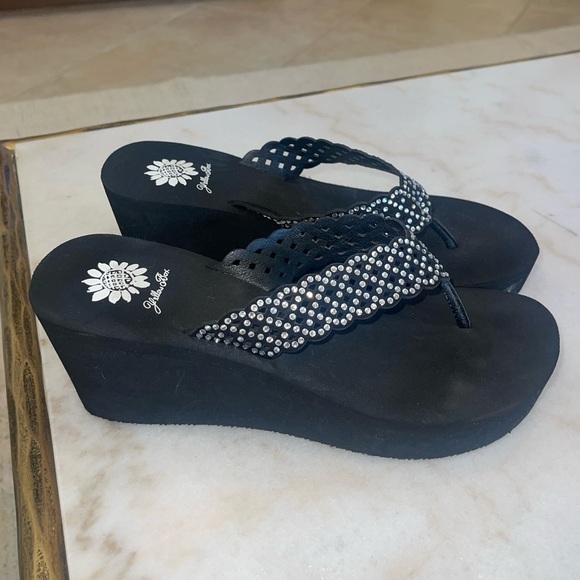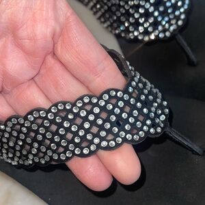 Excellent condition black wedge thong sandals by Yellow Box. Size 8.5. Lightweight, rhinestone crystal on the straps.