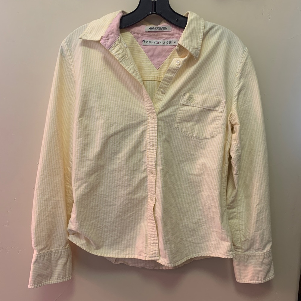 Tommy Hilfiger sunny yellow striped button up with a pink collar and cuffs. Good for summer weather and in great condition.