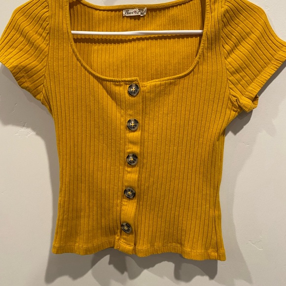 Chic mustard ribbed top with button-down front. Short sleeves and square neckline. Ideal for casual wear.
