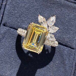 🎁 Yellow CZ Silver Plated Flower Rectangle Crystal Ring for Women, HA4399-6