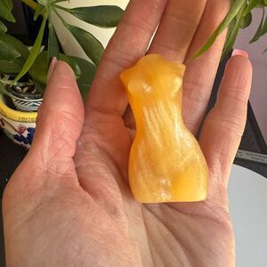 A yellow calcite crystal carving in the shape of a female body exudes warmth and positive energy. Known for its metaphysical properties, yellow calcite enhances self-confidence, clarity, and creativity. It is believed to cleanse negative energy, promote emotional balance, and inspire motivation.