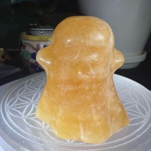 A yellow calcite crystal ghost carving is a stunning piece that showcases the vibrant, sunny hue of calcite, intricately shaped into a ghostly figure. Metaphysically, yellow calcite is believed to boost self-confidence, clarity, and positivity, while promoting a sense of inner joy and personal empowerment.