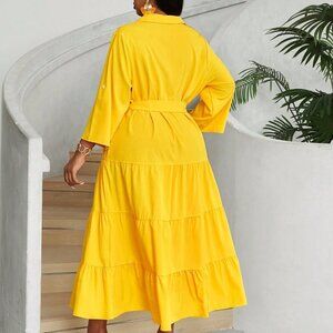 Yellow Casual Women's Plus Size V-Neck Button-Front Long Sleeve Dress