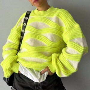 Yellow Casual Women's Round Neck Wave Stripe Color Long-Sleeved Knit Sweater