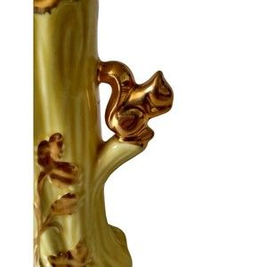 Yellow Ceramic Tree Trunk 22K Gold Trim Squirrel & Leaf Design Flower Bud Vase