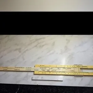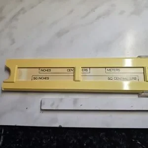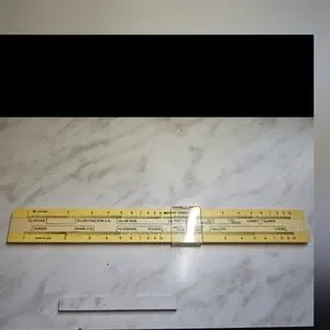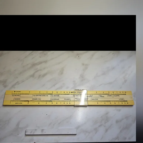 Yellow ruler with conversion tables. Features metric and imperial units. Ruler has some fading just from age. Any questions please ask.