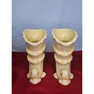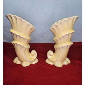 Vintage Yellow Cornucopia Shell Vase Set of 2. Marked USA # 675 at the bottom.