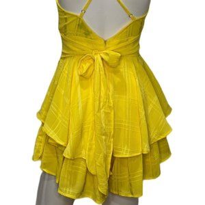 This romper has a wrap waist with tie to the back, checkered fabric design, dual ruffle trim and adjustable straps.