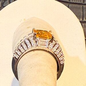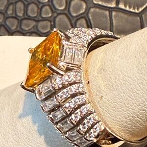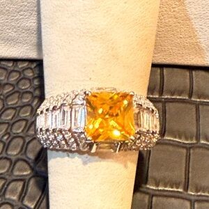 Stunning! Beautiful yellow princess cut, high quality diamond like stone, adorned with tapered baguettes and round stones.