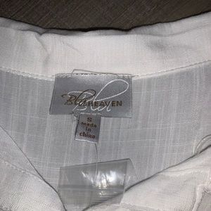 White and yellow dipped button down shirt. Has cuffed sleeves.