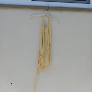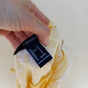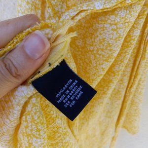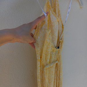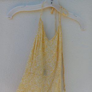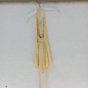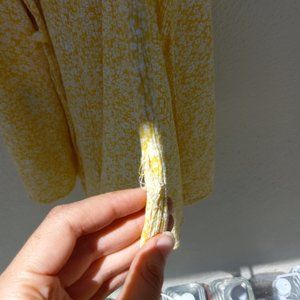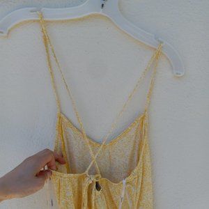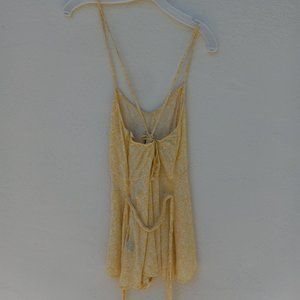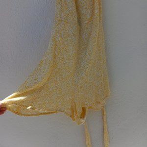 Yellow and tiny white 90s or retro style floral print shorts romper. Breezy rayon fabric. Removable self belt. I don't know exactly how the back straps are supposed to go: originally, I thought it was just a halter neck, but then I realized there are two loops at the back for the straps to lace through. I laced them in a way that criss-crosses/makes an x back. Adjustable straps/back tie; side zip. Romper is in VGUC, but there is one tear in the side/edge of the self belt- see close ups. Lightweight for the beach/poolside/vacation; can layer over white ribbed tights in early spring/fall and pair with an oversized longline cardigan. Nineties vibes paired with doc martins.
