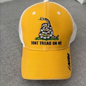 Vibrant yellow cap with 'Don't Tread On Me' design. Features a coiled snake graphic. White mesh back for breathability. SnapBack