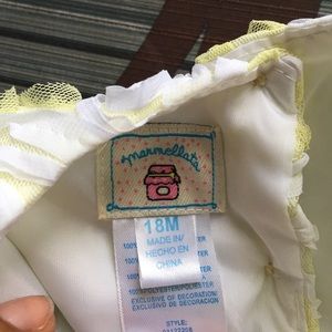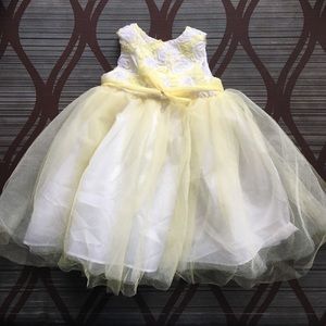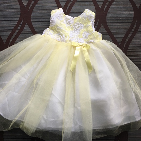 Yellow and white dress. Design at the chest area. Tulle bottom with white lining underneath. Button back.