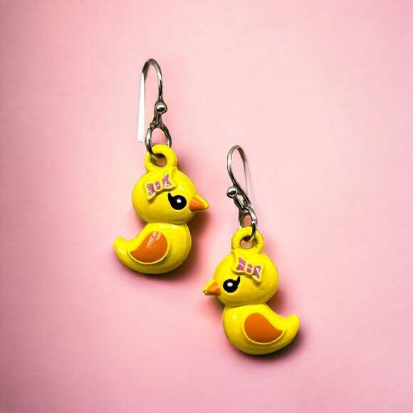 Yellow Duck Dangle Earrings Metal Ducklings Pink Bow Hooks 1 3/8"