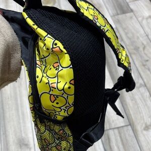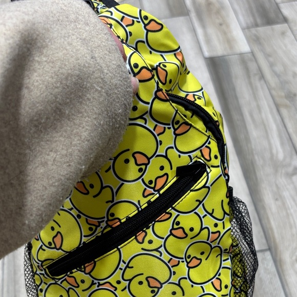 Vibrant yellow backpack with playful duck print. Features a front zipper pocket and side mesh pockets.