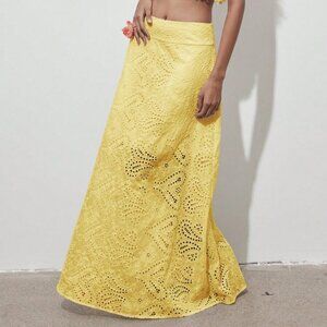Yellow Elegant Women's Floral Hollow Out Full Embroidery A-Line Maxi Skirt