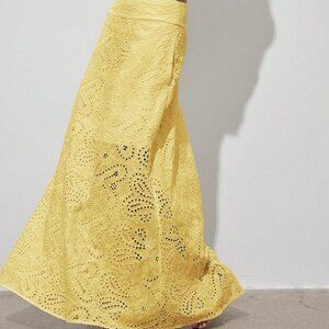 Yellow Elegant Women's Floral Hollow Out Full Embroidery A-Line Maxi Skirt
