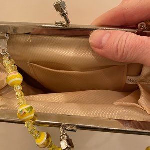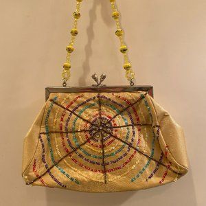 Yellow fabric bag with beads and sequins stitched on in a spider web pattern. Yellow bead handle can tuck in to make the bag a handheld clutch. Great shape.