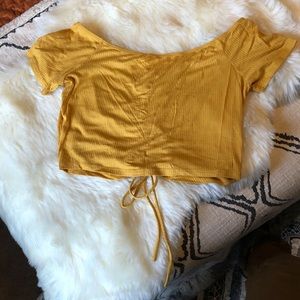 Yellow crop top with draw ties in front Extendable ties allow for more or less coverage Measurements in pictures