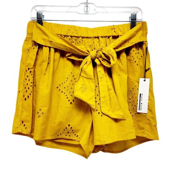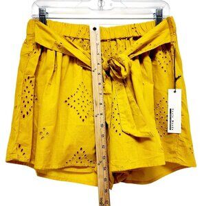 Yellow Eyelet Cotton High-Waisted Shorts With Tie Belt Size L Haute Mode