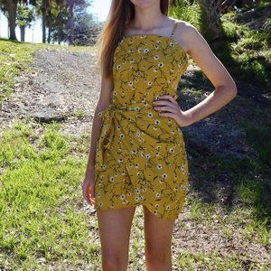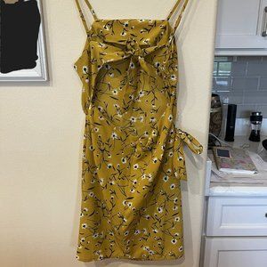 Yellow Dress with White Flowers Mock Wrap Dress Half Zipper Half Tie Back Perfect for a Summer/Spring Day
