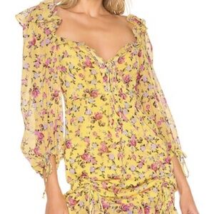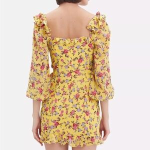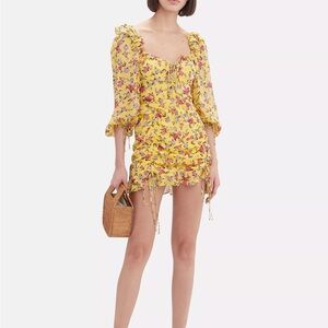 Romantic mini dress in a feminine floral fabric we love. Built in a slim fit with cinched accents along the bodice with tie closures at the ruffled hem. Topped with lace-up detailing at the bust + balloon sleeves with tie cuffs. Ruffle trim; zipper closure at the back.