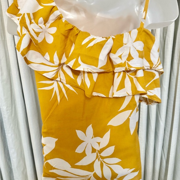 Stylish yellow top with white floral pattern and ruffle details. One sleeve. Perfect for a sunny day.. Slightly used. smoke & pet free home
