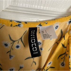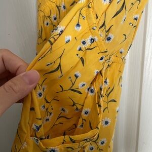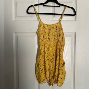 Chic yellow romper with floral print. Features spaghetti straps and a relaxed fit. Worn once and in great condition