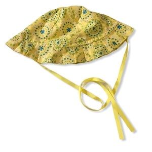 Yellow Floral Pleated Ruffle Bucket hat with tie under chin. Marked a one size toddler girls when originally purchased. No brand or size tags. Good used condition with no major flaws. Smoke free, pet free home. Ships same or next day