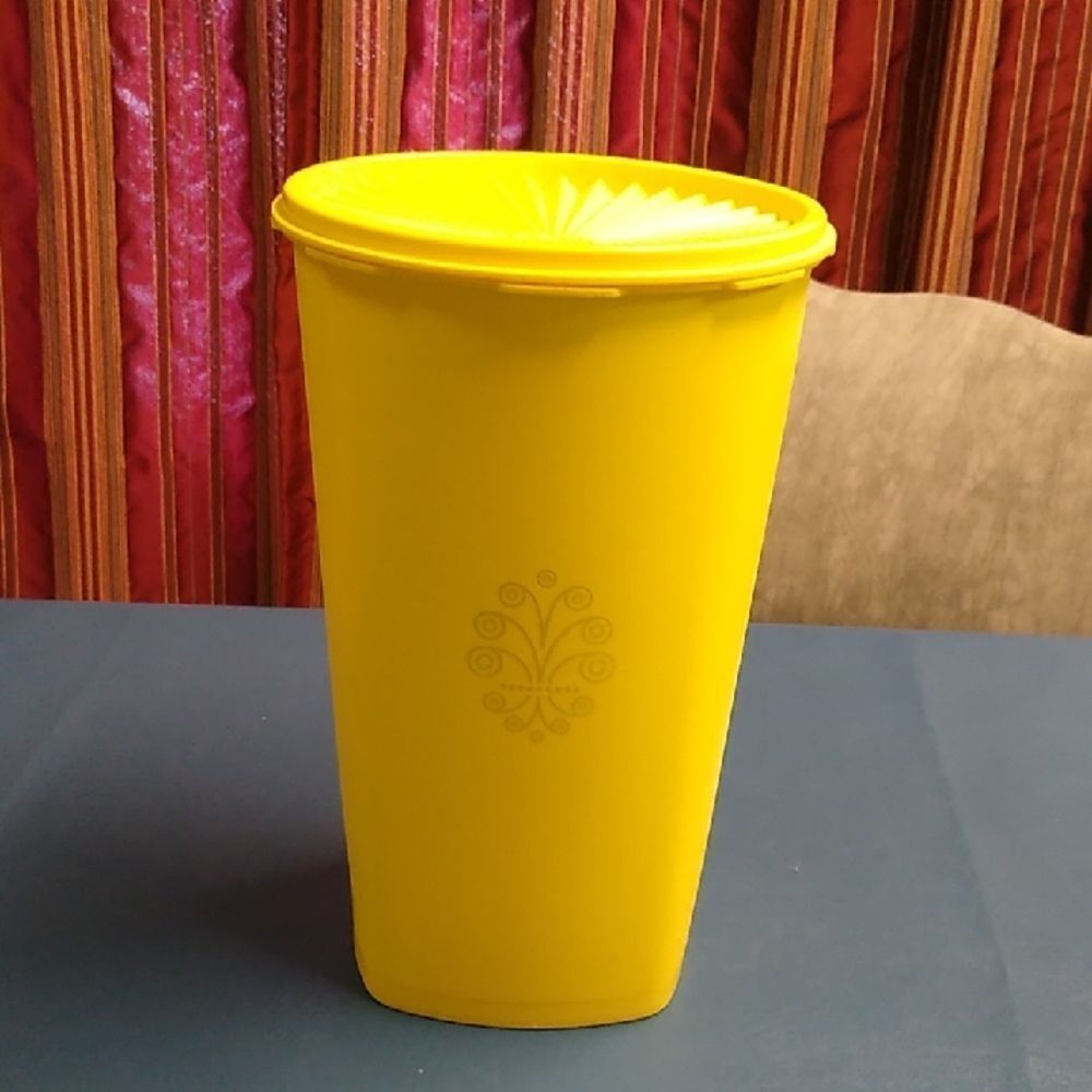 Bright yellow Tupperware container. Features a decorative design. Ideal for storage.
