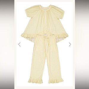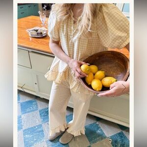 Charming yellow gingham set with ruffle details. Includes a top and pants.