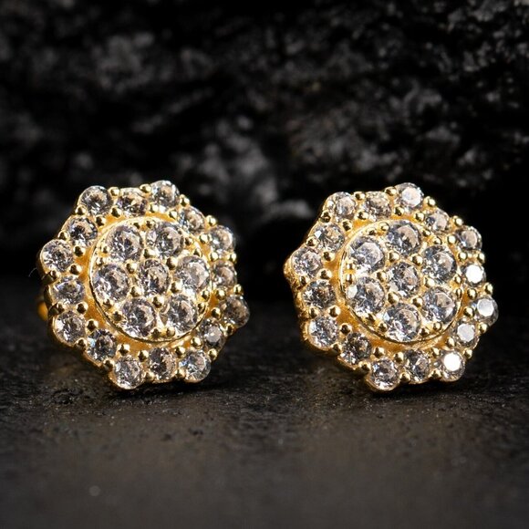 Halo Octagon Flower Cluster Men's 14K Yellow Gold 925 Sterling Silver Cz Round Sterling Silver Bling Honey Comb Set Cubic Zirconia Hip Hop Stud Screw Back Earrings Jewelry Gifts For Men Women.