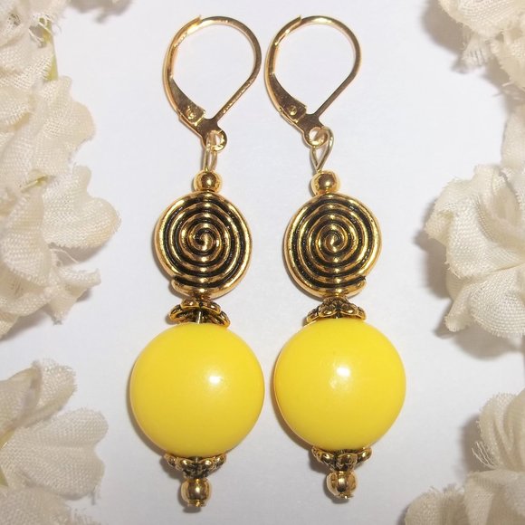 This colorful earring set is brand new & handcrafted by me - wvluckygirl. Done with yellow acrylic beads and rustic antiqued gold toned costume jewelry beads. The pair dangle & drop from lever backs for her pierced ears. 2 1/8 inches tall & 1/2 inch round. Each single earring weighs 2.7 grams. Show off your individual style with this attention getting set.