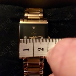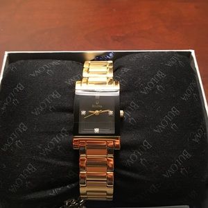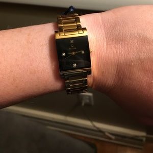 Yellow gold, Bulova women's watch, diamond chips, still has tags, royal blue face, needs new battery. 68% off retail price and never been worn! Amazing condition.