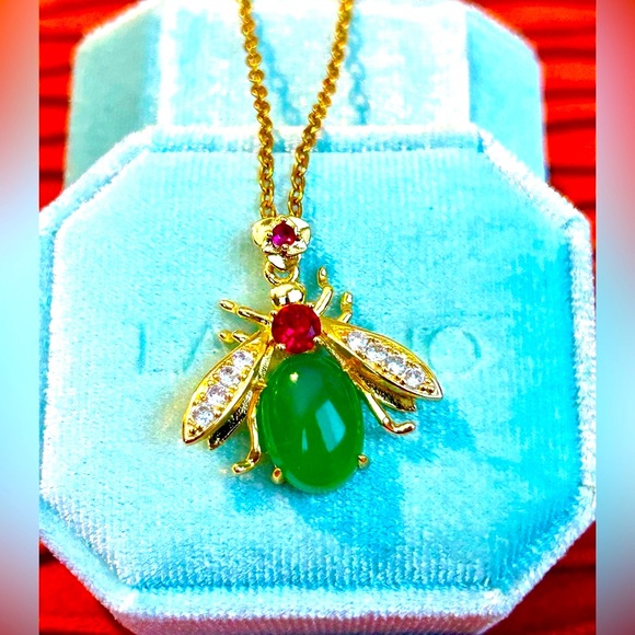 Yellow Gold Plate Green AGATE JADE PENDANT Bee Cabochon Faux Diamond Faux Ruby