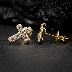 Iced Cz small prong set yellow gold cross earrings men: Our mens cross studs are iced with 5A cz stone hand set, offering you the most dazzling and cool earrings for men. Step up your style game with these stunning Ice Out Earrings Men